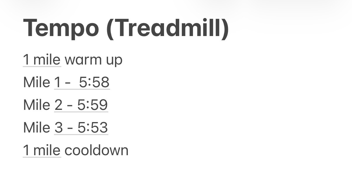 1600 tempo, 2x400, 1600 tempo, 2x600, 1600 tempo. I feel good during the 1600 tempos, but the shorter distances were difficult as usual. Good workout 👍